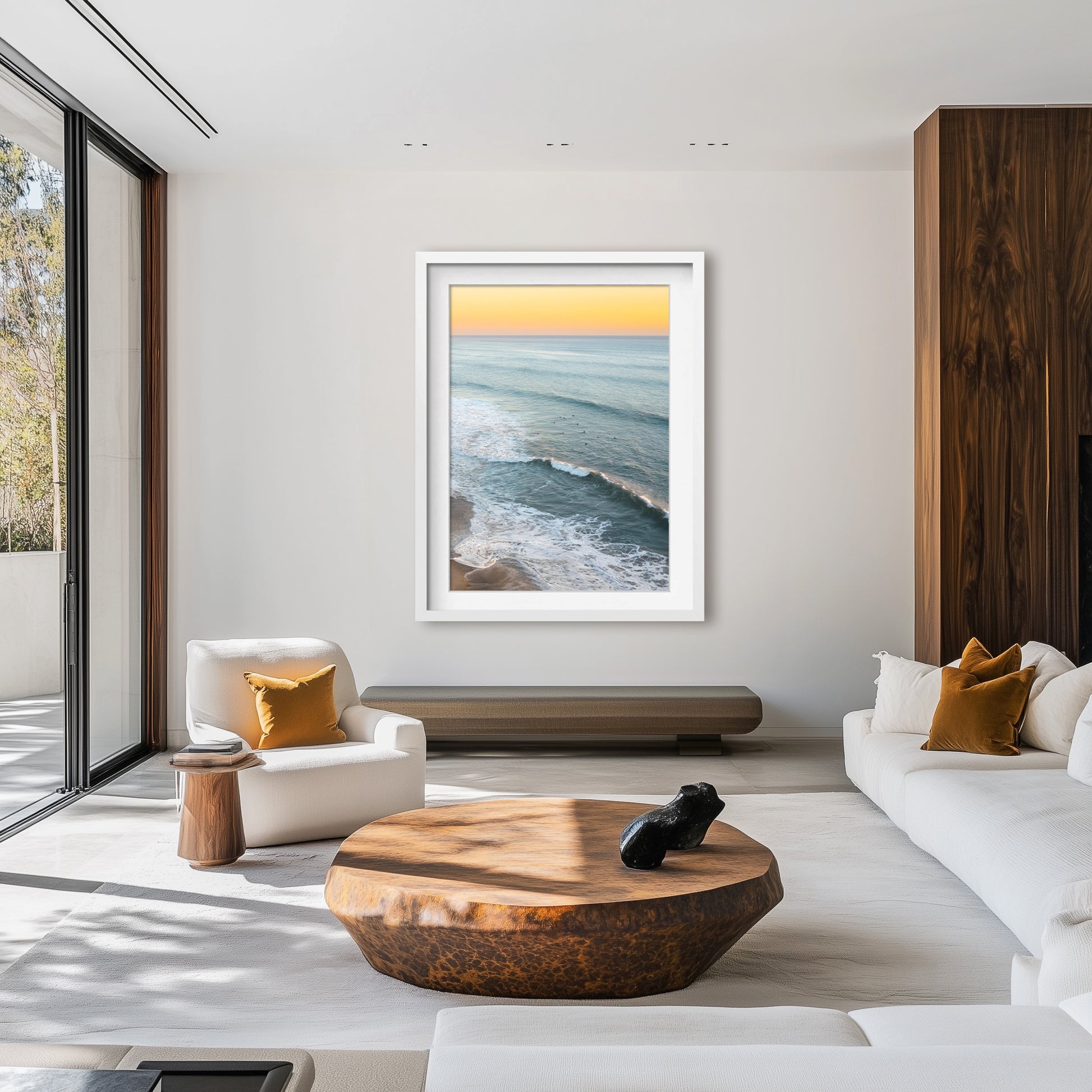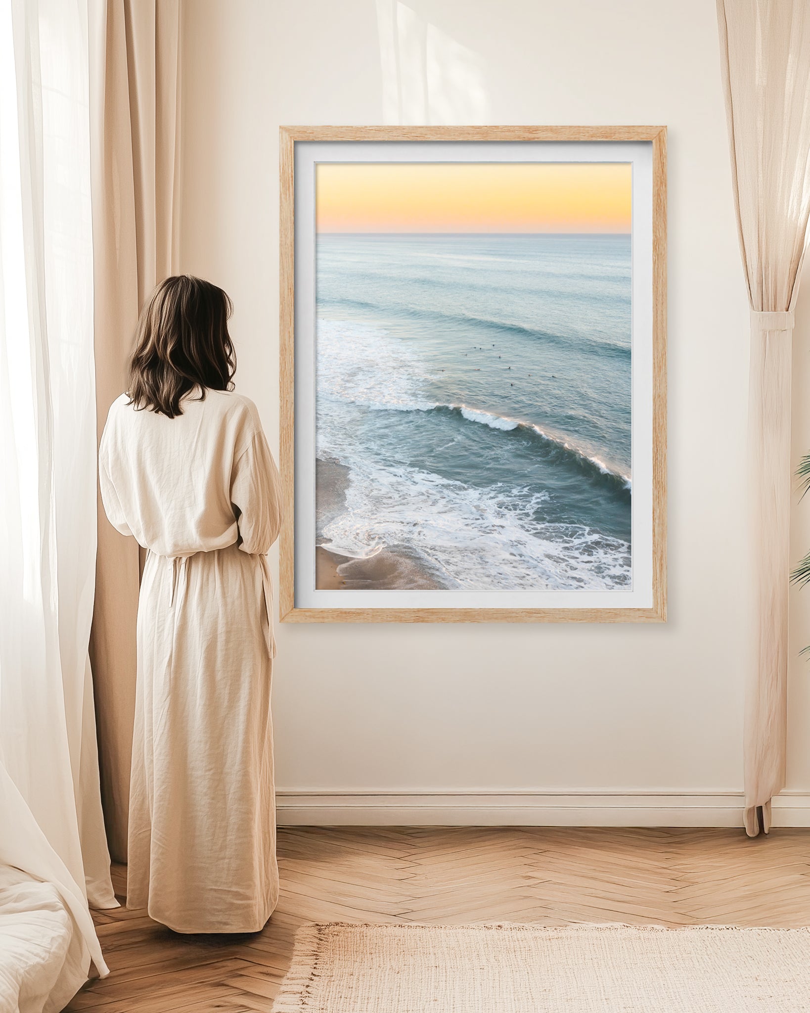 Our solid wood frames are imported from Italy, then cut and joined locally in Southern California. Prints are expertly mounted with a 2-inch mat board to provide the sturdy feel, flush setting and high quality aesthetic you'd find in any fine art gallery. Each frame is handcrafted with a sheet of UV-blocking acrylic glass and comes with self leveling hanging hardware, so your artwork is ready to hang as soon as it arrives.